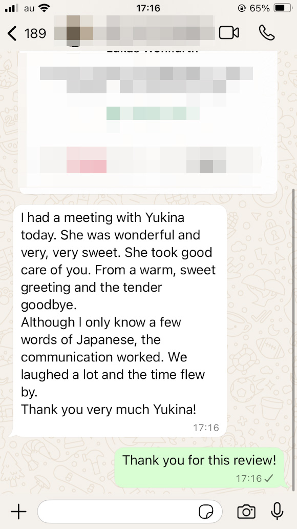 For my second visit to GFE, I decided to book a 180 appointment in advance with Yukina after reading over her profile, posts, and reviews. I contacted her through DM and she was very friendly and accommodating with my schedule. She was just as friendly in person, as well as affectionate. She is petite, and cute both in appearance and personality. She's very attentive and an absolute pleasure to spend time with. My Japanese was limited, but we had fun communicating through Google Translate once we were tired out (perhaps more me than her). She is fantastic, highly recommended, and I hope to see her again on my next visit. I feel like I could kiss her forever.