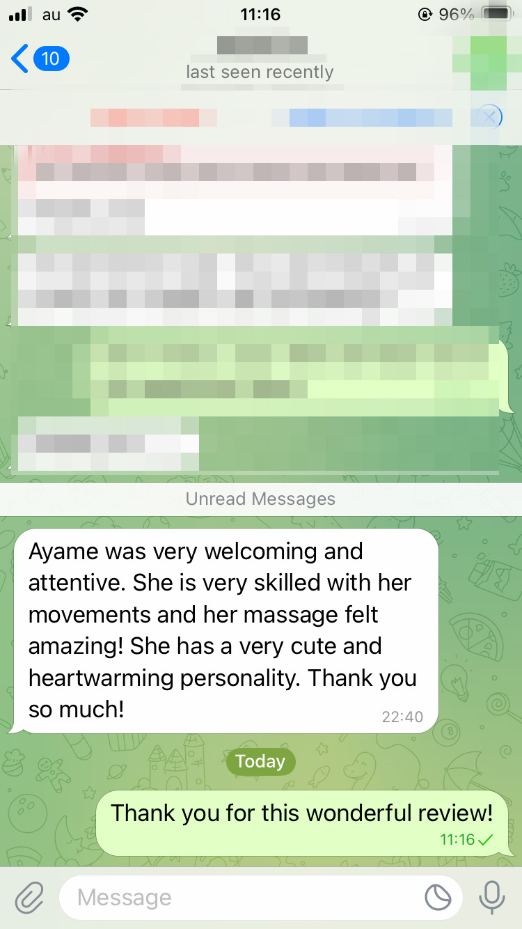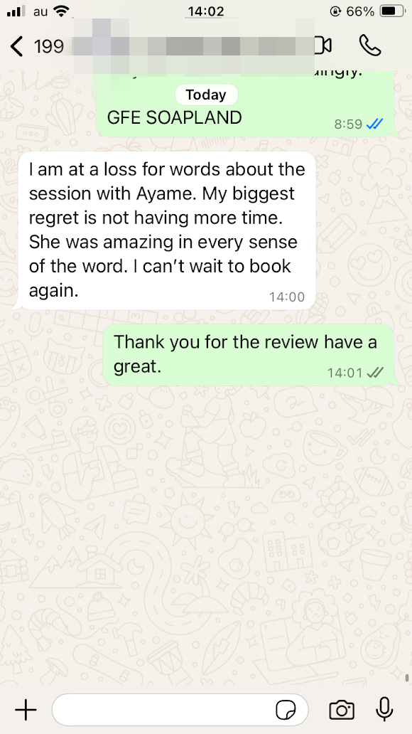 Met Ayame on Halloween. Had an amazing session with her. She was very kind and funny. Her eyes are definitely mesmerizing, I couldn't believe how beautiful they were. Definitely enjoyed all 90 minutes.