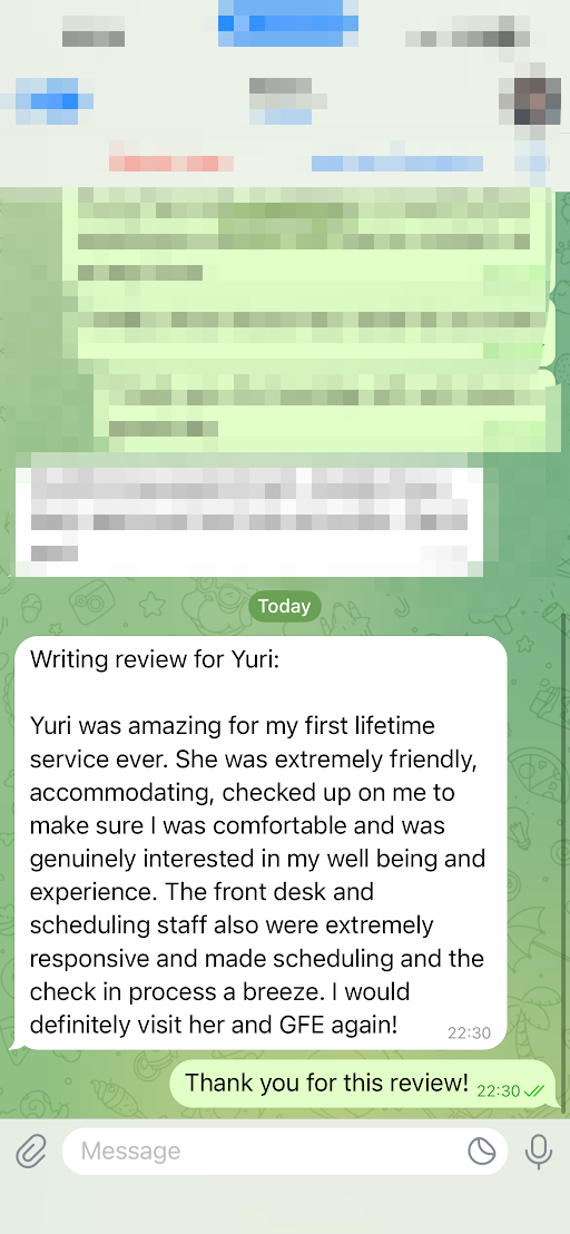 Excellent experience during my first Japanese nuru massage! Yuri is lovely – warm and sweet. Good English, so conversation is a breeze. This all makes GFE unforgettable! Highly recommend!