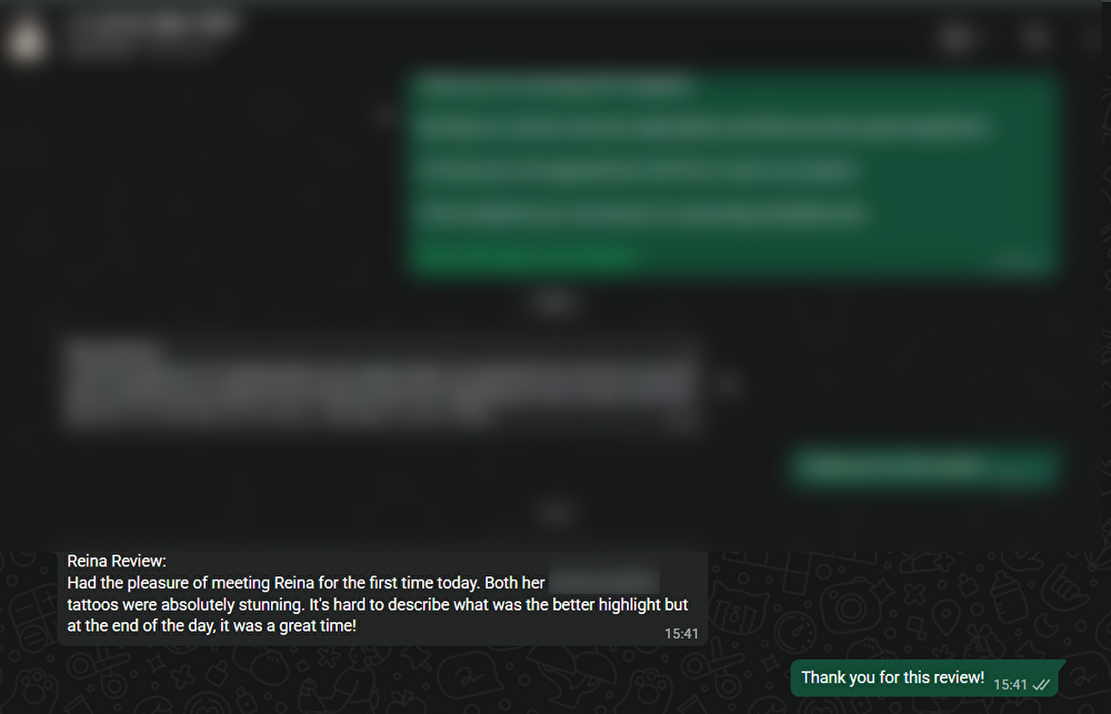 I saw Reina on Monday again during an evening session. She was great as always and looking forward to seeing her again. 10/10 experience.