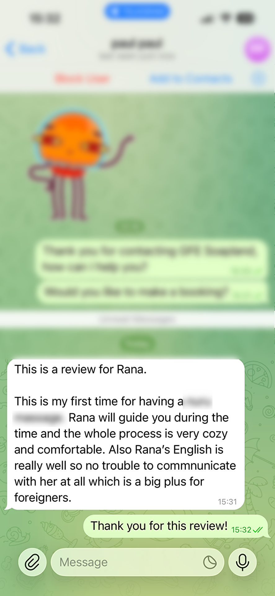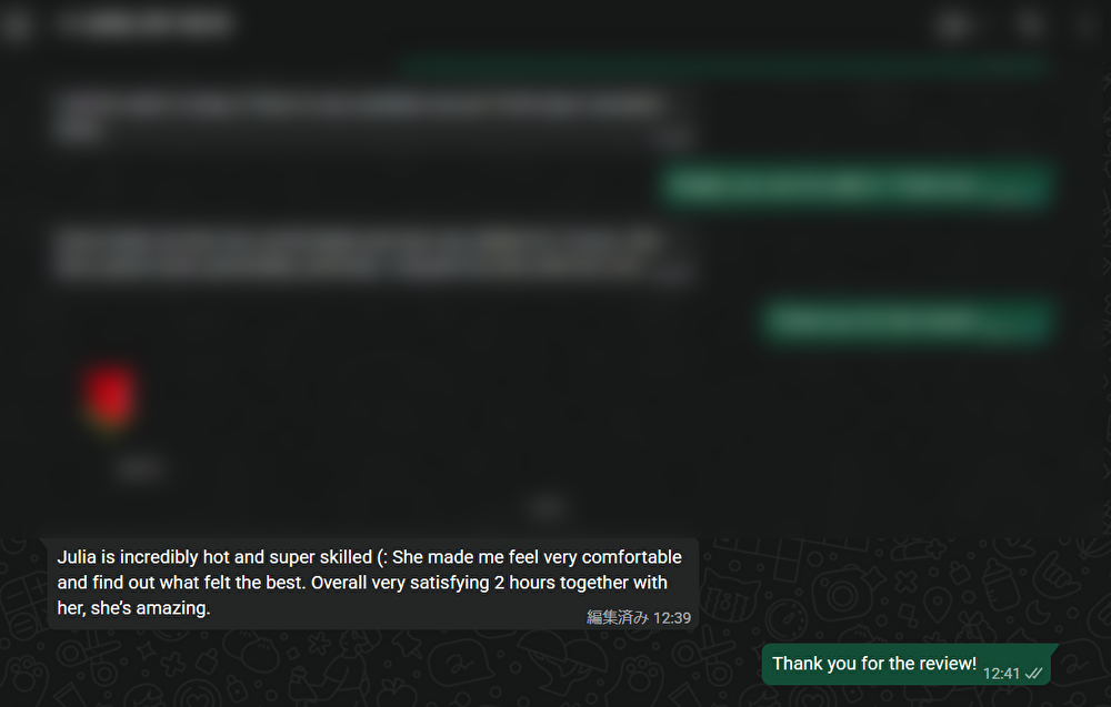 I only have an hour with Julia because of time constraints, but she made that 1 hour feel doubled with how she converses and how she takes care of you. The way she moves and "operates" you is on a whole different level, as if being spoiled every minute of the session. She's a 5-star for a reason, and definitely worth it to find out why! Hopefully I could come back to Japan again soon, and Julia would definitely be in my Priority List!