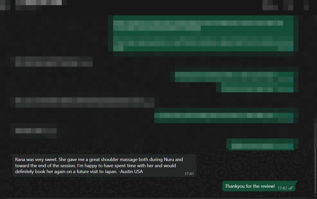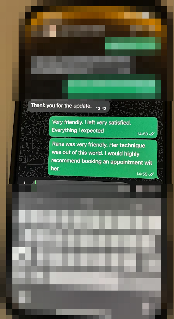 Rana was absolutely amazing from start to finish.She’s gentle, attentive, and full of positive energy. In person, she’s even more beautiful than in her photos—slim, elegant, and with the kind of charm that makes you feel instantly comfortable. Her smile is simply captivating.Because she speaks English, we could chat and laugh easily, which made the whole experience even more relaxing. Her technique was incredible—the 120 minutes went by in a flash.Both the chair and nuru massage were unbelievably soothing, as if she had more than two hands working in perfect harmony.Rana is truly world-class. I can’t wait to see her again next year.