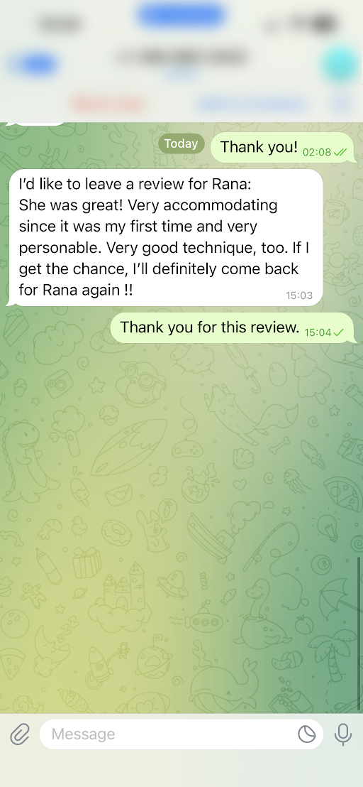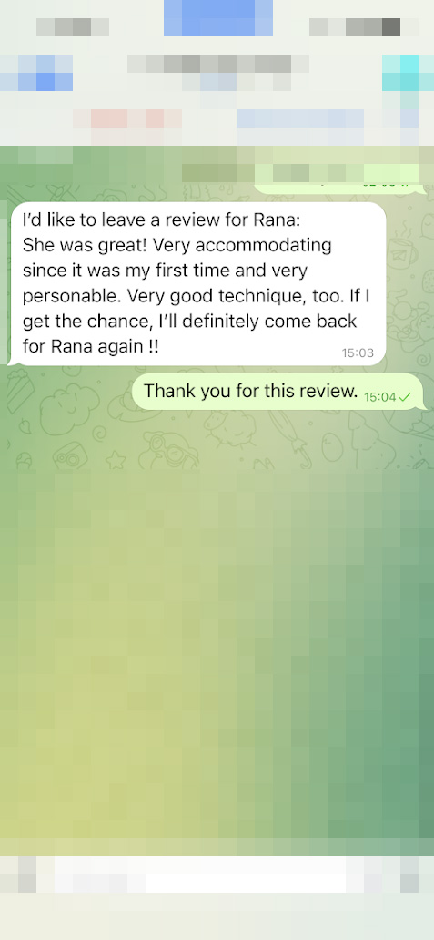 I was able to meet Rana yesterday and she was just purely unbelievable from the moment we met. She’s so cute, friendly, caring, and really provides the best experience ever. It was such a wonderful and meaningful time, I truly loved getting to know each other better. Genuinely thankful for Rana and the time she spent with me.
