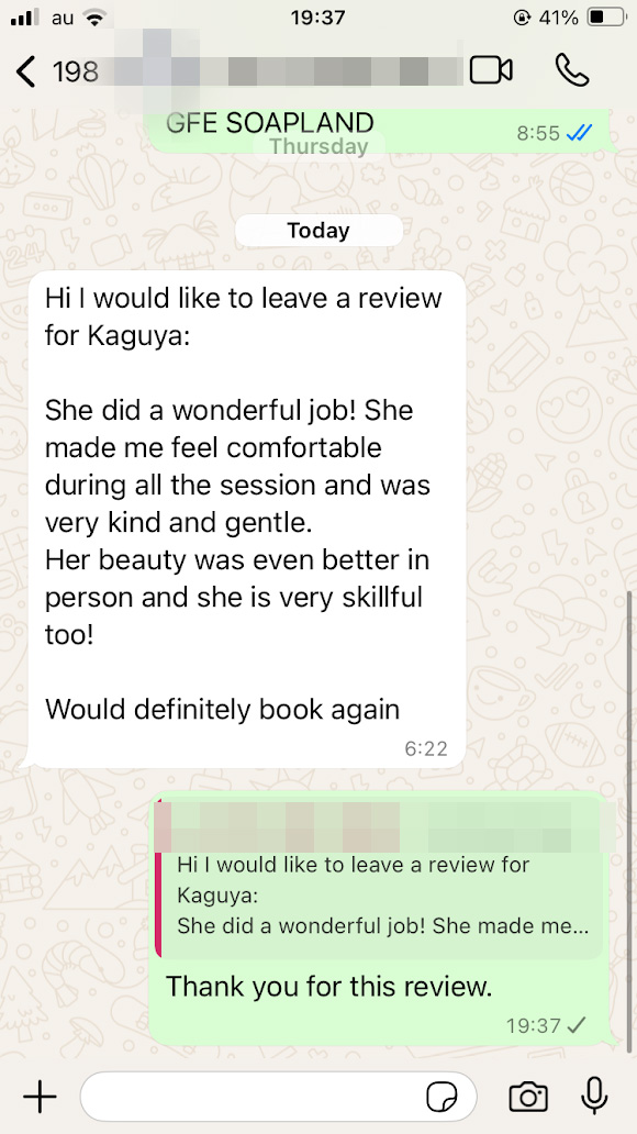 Kaguya was my first time going to a Soapland. She really made me feel comfortable and at home throughout the whole session. Her massage was incredible and she was able to have a nice conversation, despite my broken Japanese. I would highly recommend and even consider going again.