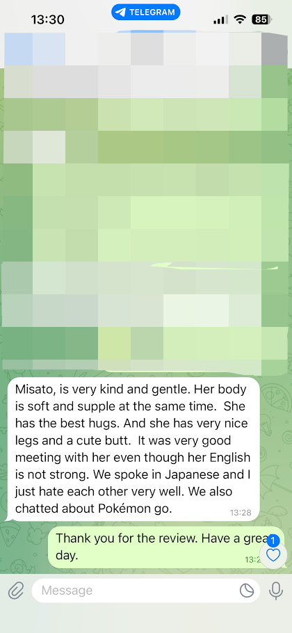 Misato san was amazing, she is beautiful with a great body, she took really good care of me, she managed our time together really efficiently, and even tho we didn’t speak each others language we could communicate easily and it still felt like we shared some genuine conversation and a good time, true gfe experience, would recommend 100%