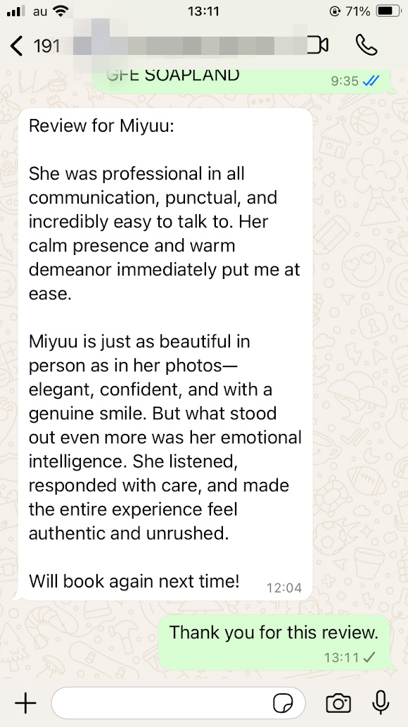 Miyuu was amazing, she’s very cute and her English was great. Her attention to detail throughout was outstanding and she is just someone who is great to spend time with. Amazing experience would most definitely recommend!