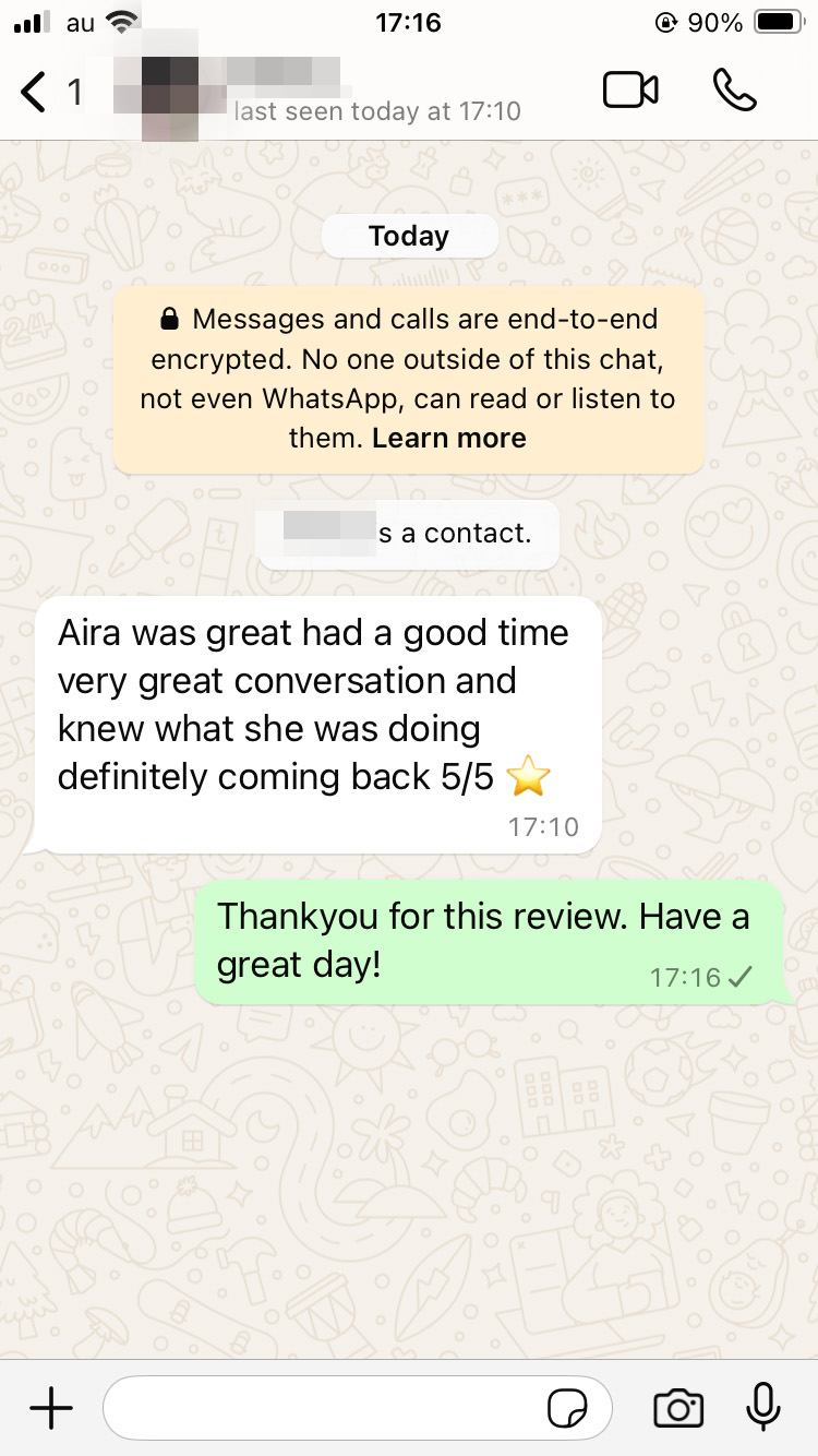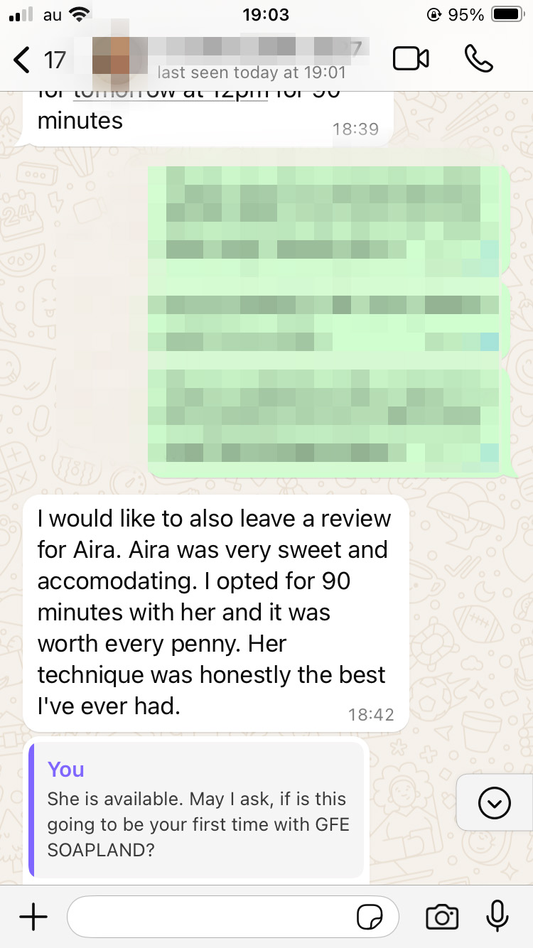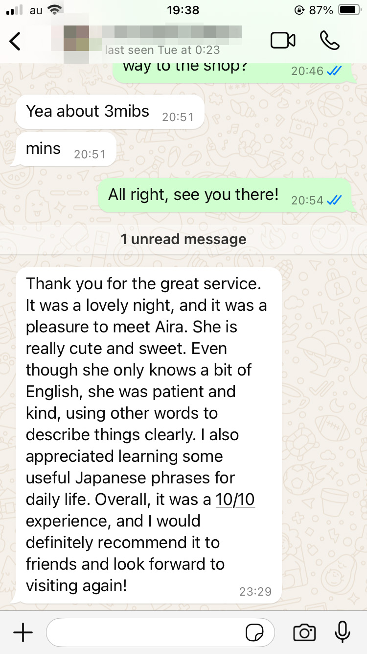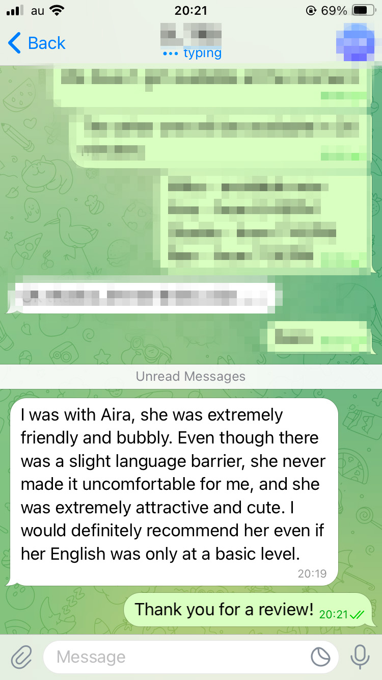My experience was more than 5 stars + Aira had a beautiful curves so it was very perfect to hold and feel her body was heaven, I regret it was short time I needed an extra round :) She's the best kisser., it was very easy to relax and get excited for the bed action it was powerful bliss, we talked about rock music but my rock was so happy, I will cum back soon. Thank you so much, let's get sideways again more please hehe