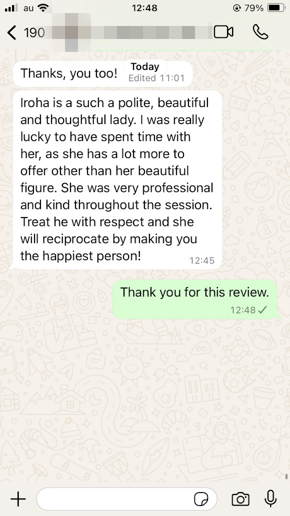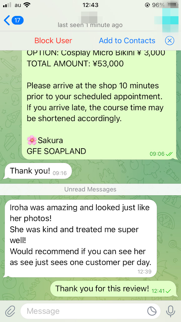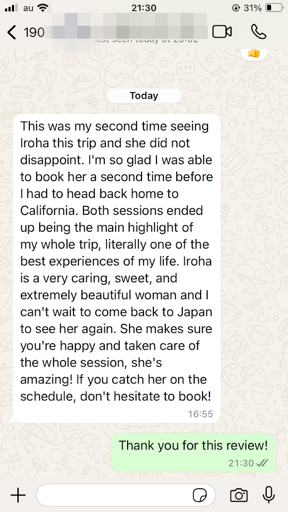 On May 3 2025, I had the pleasure of having Iroha for the third time (though it had been six months). Ive been meaning to see her forever, but work and other things have been keeping me from her and I truly missed her a lot to the point that I had to book the full 90 minutes with her. As always, seeing her in a micro bikini on that figure of hers is always a turn on, so I just had to have her wear it. And I must say, blue is certainly her color. While I dont get to have a Golden Week, whatever 90 minutes I had with her was enough break time for me. Being in her presence is truly a blessing and her touch is an honor. Being with a Goddess like her gives me all the confidence I need to get through things. Shes not only drop dead gorgeous, but kind, thoughtful, and attentive. If you want an idea of what she looks like, look up Mion Hazuki, the AV star, and you can get some idea on what Iroha looks like.