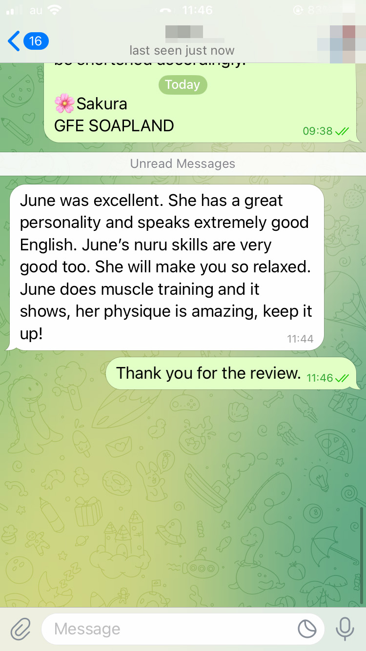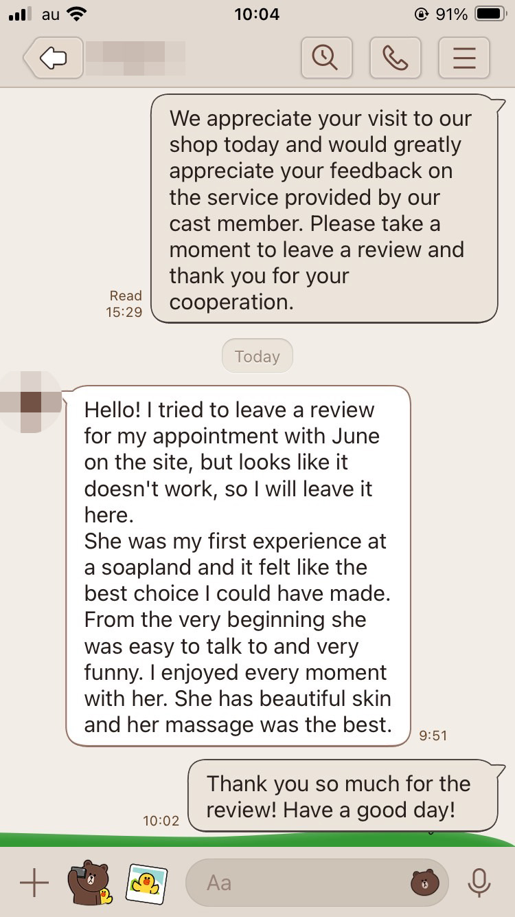 June was my first experience at a soapland. She is simply amazing at what she does and was always good to me since the days of Paradise. She's beautiful, sexy, caring, friendly and a fun person to be around. Having conversations and interacting with her feels like being with a long-time friend. If you get the chance to be with her, she will not disappoint you, I guarantee it. Thanks for everything, June!