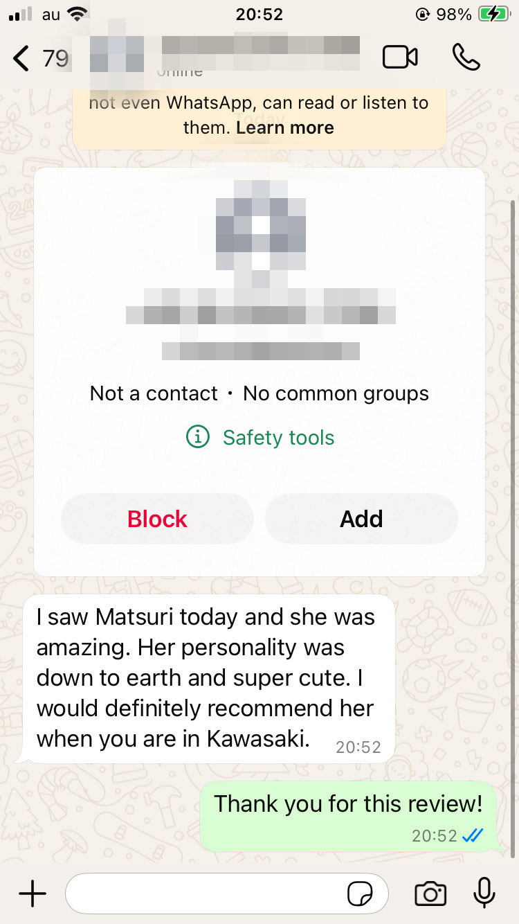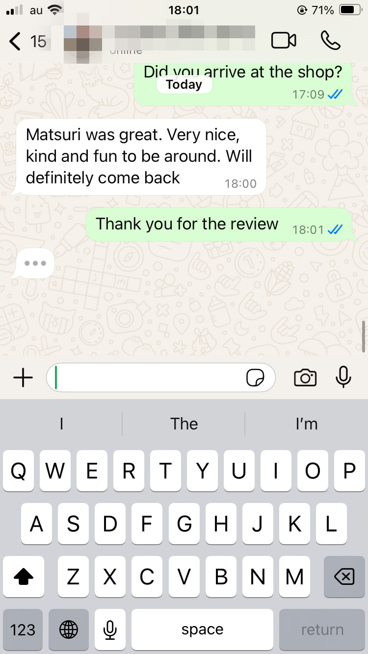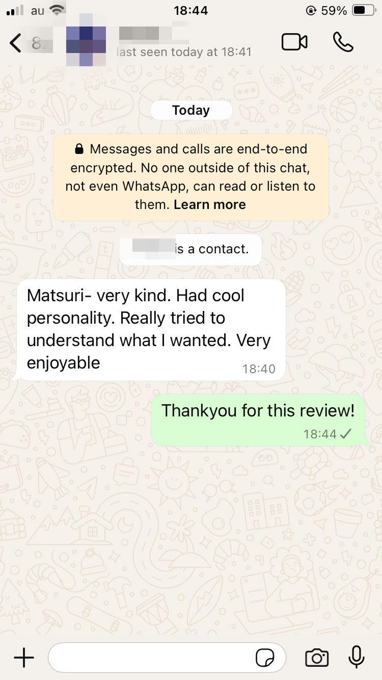 Amazing experience with Matsuri, she is kind and generous in every way. Perfect 10/10 spending time with her made my whole day.