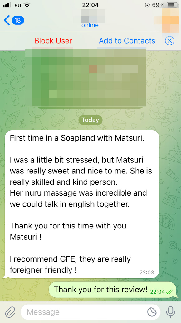 Matsuri was incredible, extremely nice soft feminine.. she spoke little English but it was enough. The facility and staff were nice too. It felt safe and private. Thank you for the experience.